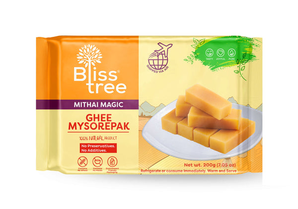 Indulge in the rich and aromatic flavors of India with Bliss Tree's Ghee Mysore Pak! Made with love and tradition, each bite of this decadent Indian sweet will transport you to a land of blissful delight. Our sweets are freshly lifted via air to ensure maximum freshness, free from preservatives or additives. With our new packaging, it's not just a treat for yourself but also the perfect gift for your loved ones. Simply warm and serve for an authentic taste experience that will leave you craving more!